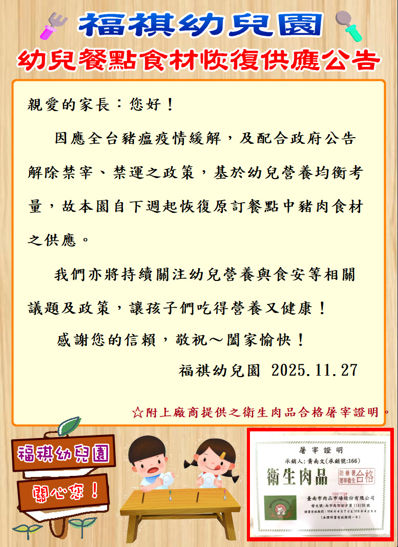 ★ 福祺幼兒園 《因應豬瘟疫情緩解,恢復豬肉食材供應》★