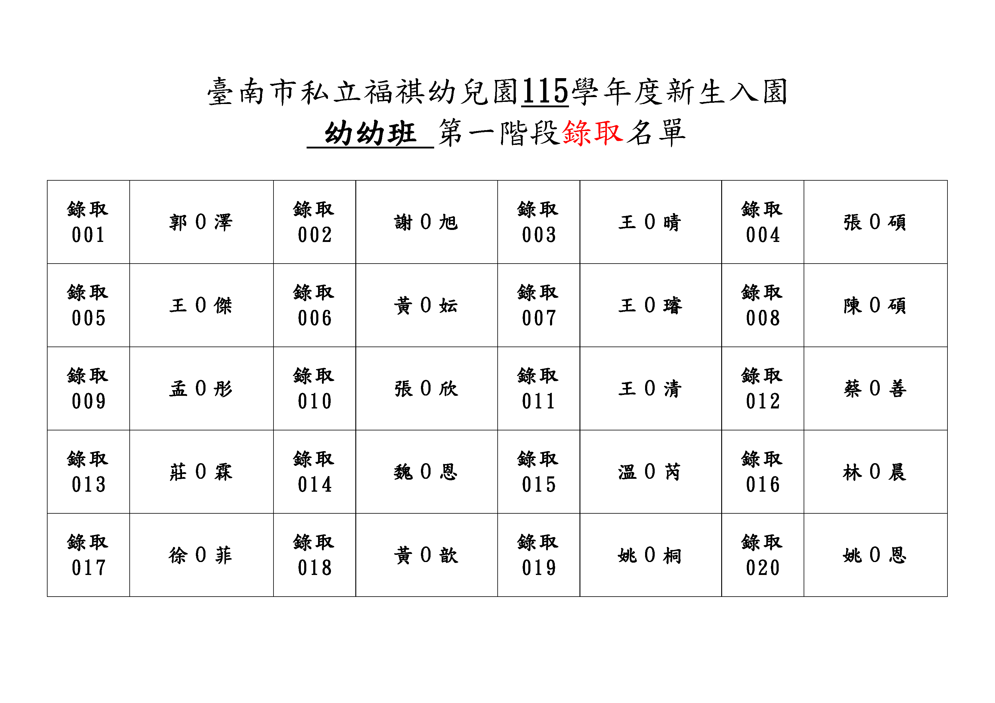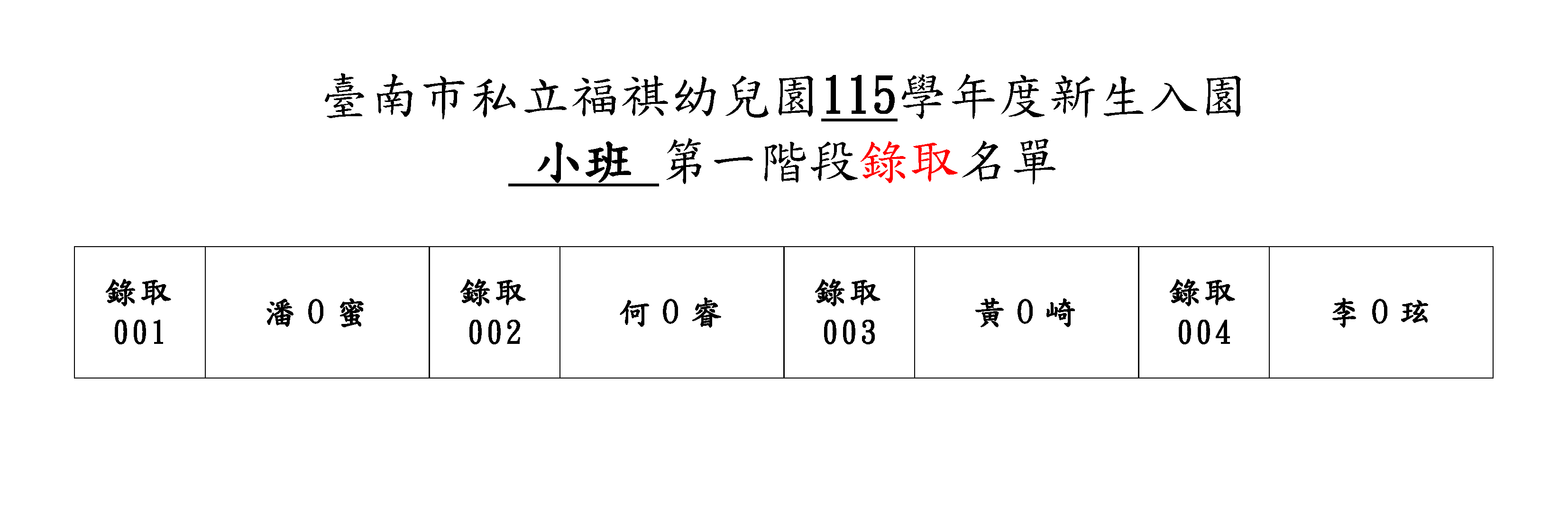 ★ 第一階段優先入園報名人數 : 小班:4人、幼班:20人 ( 全額錄取 )